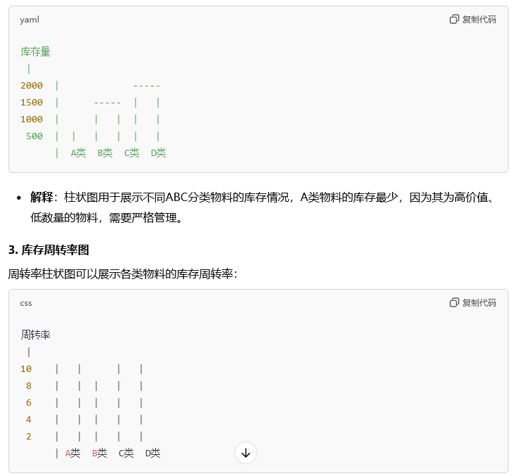 图表可以将库存的趋势、周转率、安全库存等关键数据以直观的方式展示,常见图表类型包括: