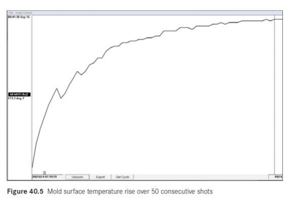 模温低也会影响塑料对模腔的充填能力。模温低会导致塑料的冻结层变厚,会限制塑料在模具里的流动长度。模具 的表面温度会在塑料温度的带到下慢慢升高(图 40.5),如果刚开始生产时模具的局部薄胶位充不满,可能是模具 的表面温度还没有升到需要的温度。