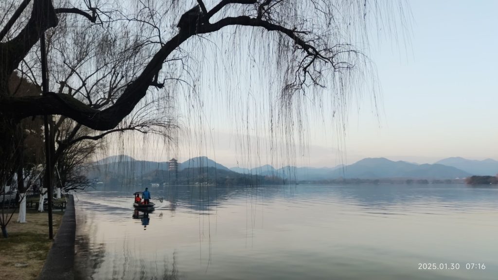 七点整的放鹤亭已有三五行人。穿玫红羽绒服的奶奶对着湖面舞太极剑,剑穗扫过的地方,霜花便化作细碎虹光;戴毛线帽的男孩朝空中呵气,白雾里隐约显出新岁的生肖轮廓。我踩着湖滨路折返时,第一艘游船正轻轻划开倒悬的孤山,惊起的寒鸦掠过柏树林,翅尖扫过苏堤春晓碑的刹那,残冬的霜痕忽然泛起琉璃色。