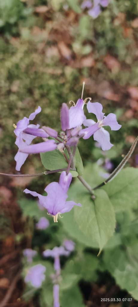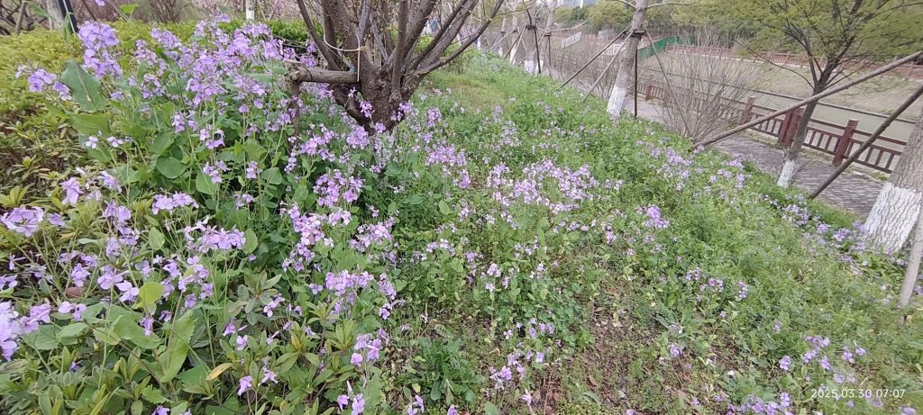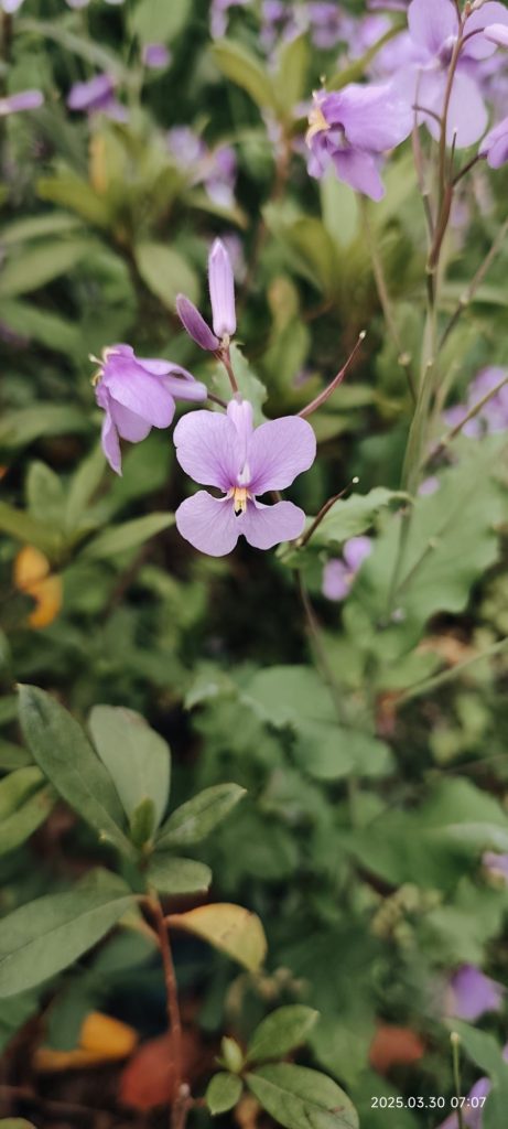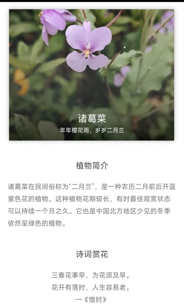 二月兰,也叫二月蓝、紫金菜、菜子花,诸葛菜,十字花科诸葛菜属一年生或两年生草本植物。典型的十字花科植物,小花裂为4瓣。颜色一般为蓝紫色,不过园艺栽培中,有的会是紫红色,还有的变为白色。花的大小跟油菜花差不多。蓝紫色梦幻,紫红色朴实,而白色淡雅,不管哪种颜色,都是显眼的存在。